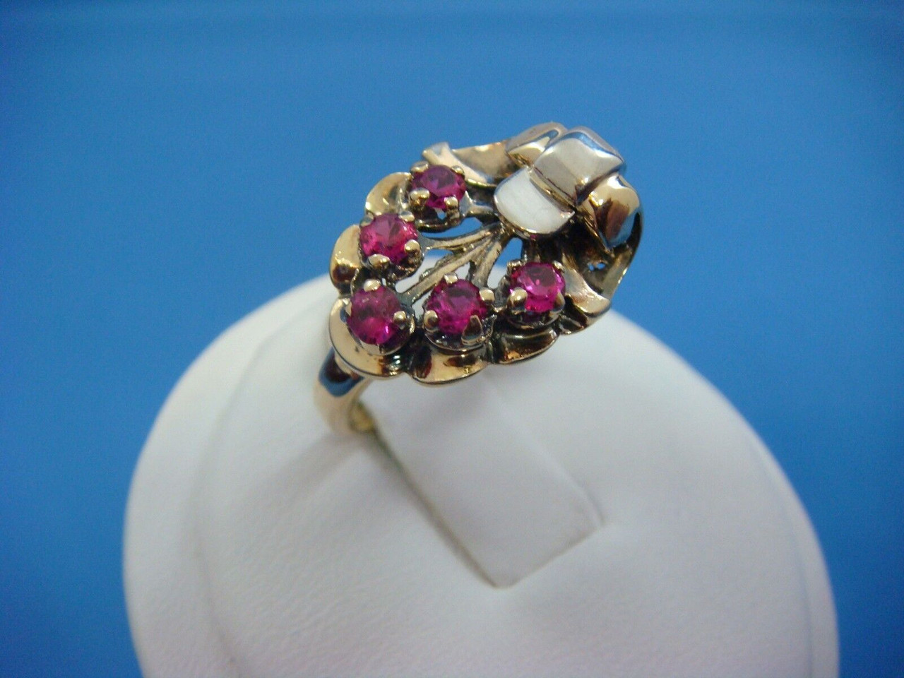 UNIQUE 14K YELLOW AND WHITE GOLD ANTIQUE RING WITH RUBIES, FLOWER MOTIF, 5.1 GRAMS, SIZE 4.